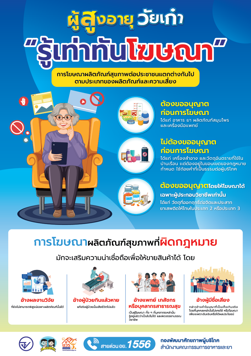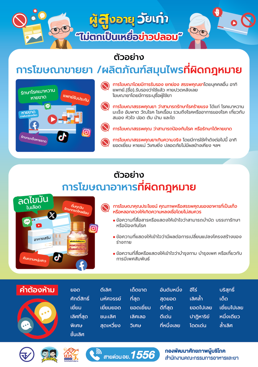 ผู้สูงอายุควรรู้เท่าทัน ไม่ตกเป็นเหยื่อข่าวปลอมหรือโฆษณาผิดกฎหมายบนสื่อออนไลน์ เพราะหลายโฆษณามักอ้างสรรพคุณเกินจริง เช่น “รักษาโรคหายขาด” “…