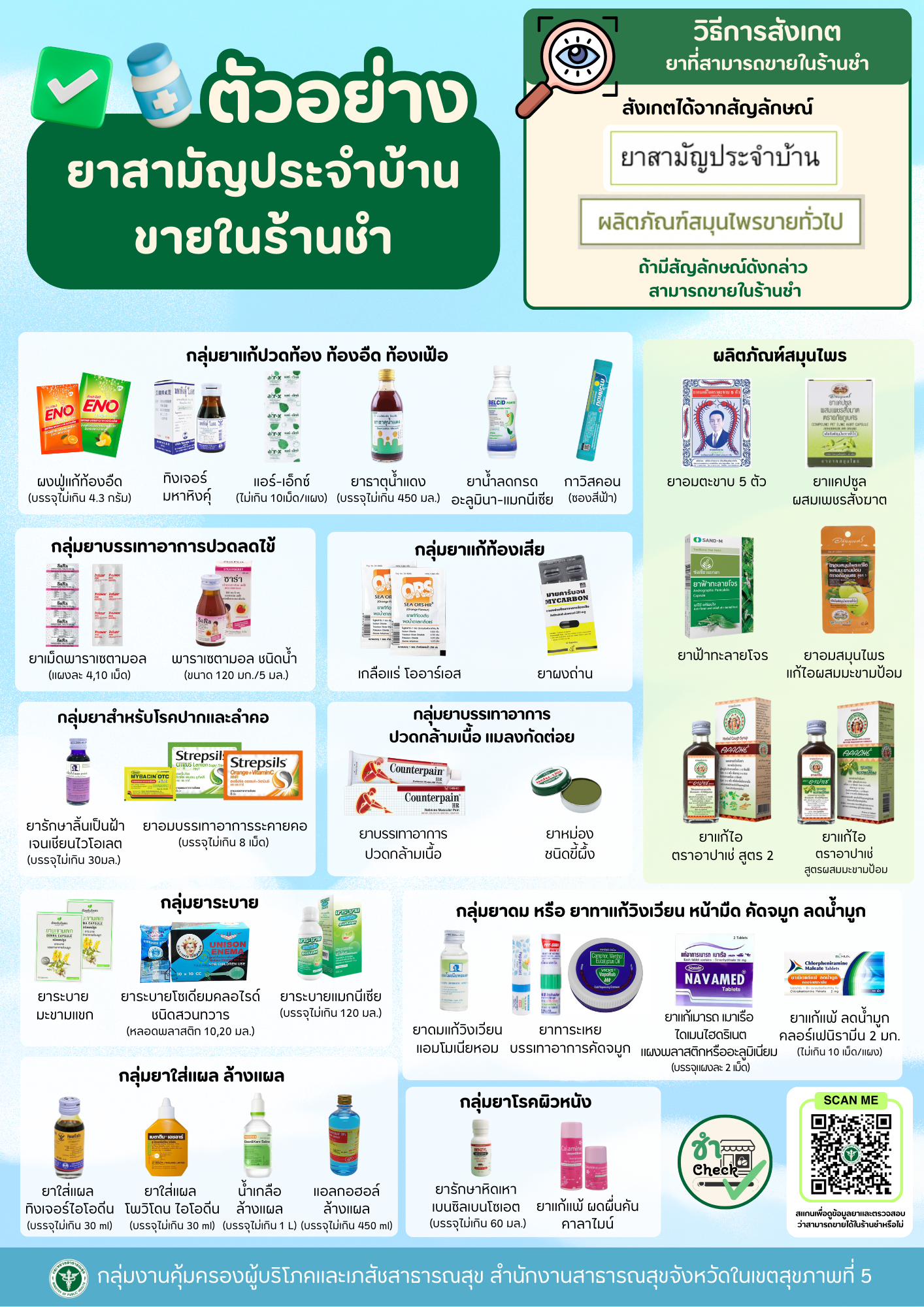 อินโฟกราฟิกให้ความรู้ประชาชนเกี่ยวกับ ยาสามัญประจำบ้านที่กฎหมายอนุญาตให้จำหน่ายในร้านชำ พร้อมตัวอย่างกลุ่มยา อาทิ ยาแก้ปวด ลดไข้ ยาแ…