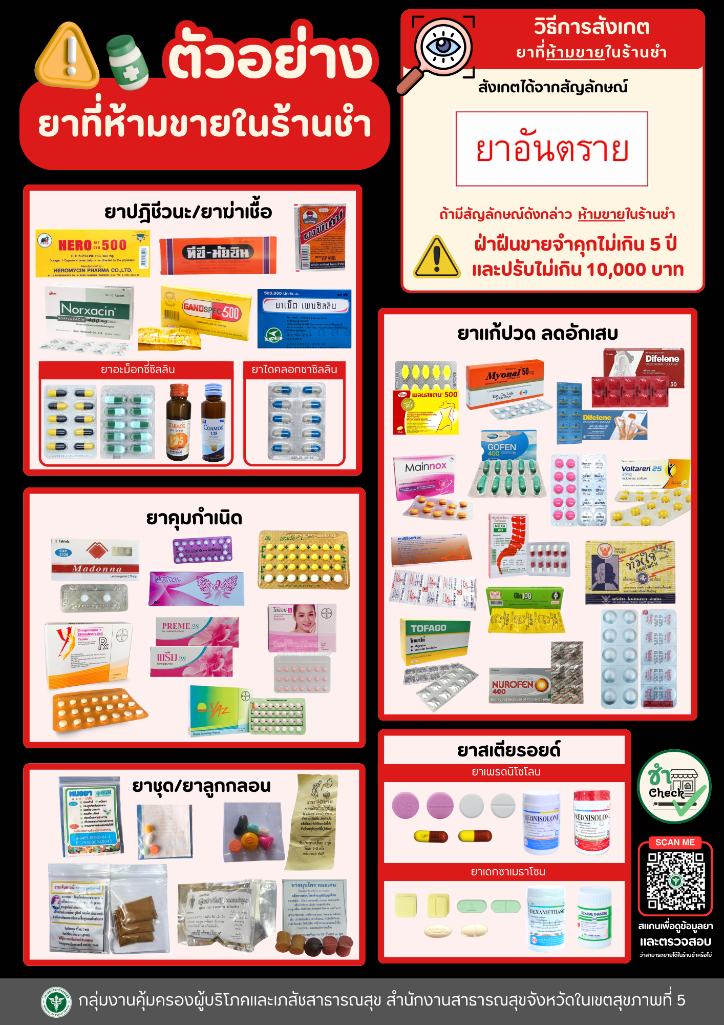 อินโฟกราฟิกให้ความรู้ประชาชนเกี่ยวกับ ยาที่กฎหมายห้ามจำหน่ายในร้านชำ โดยสามารถสังเกตได้จาก สัญลักษณ์ “ยาอันตราย” ตัวอย่างกลุ่มยาที่ห้าม…