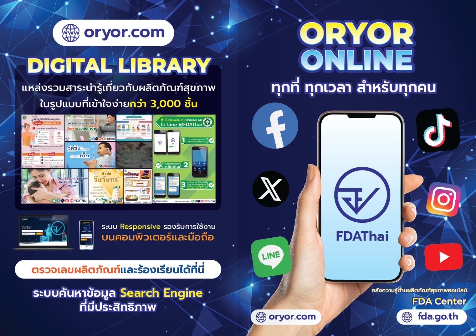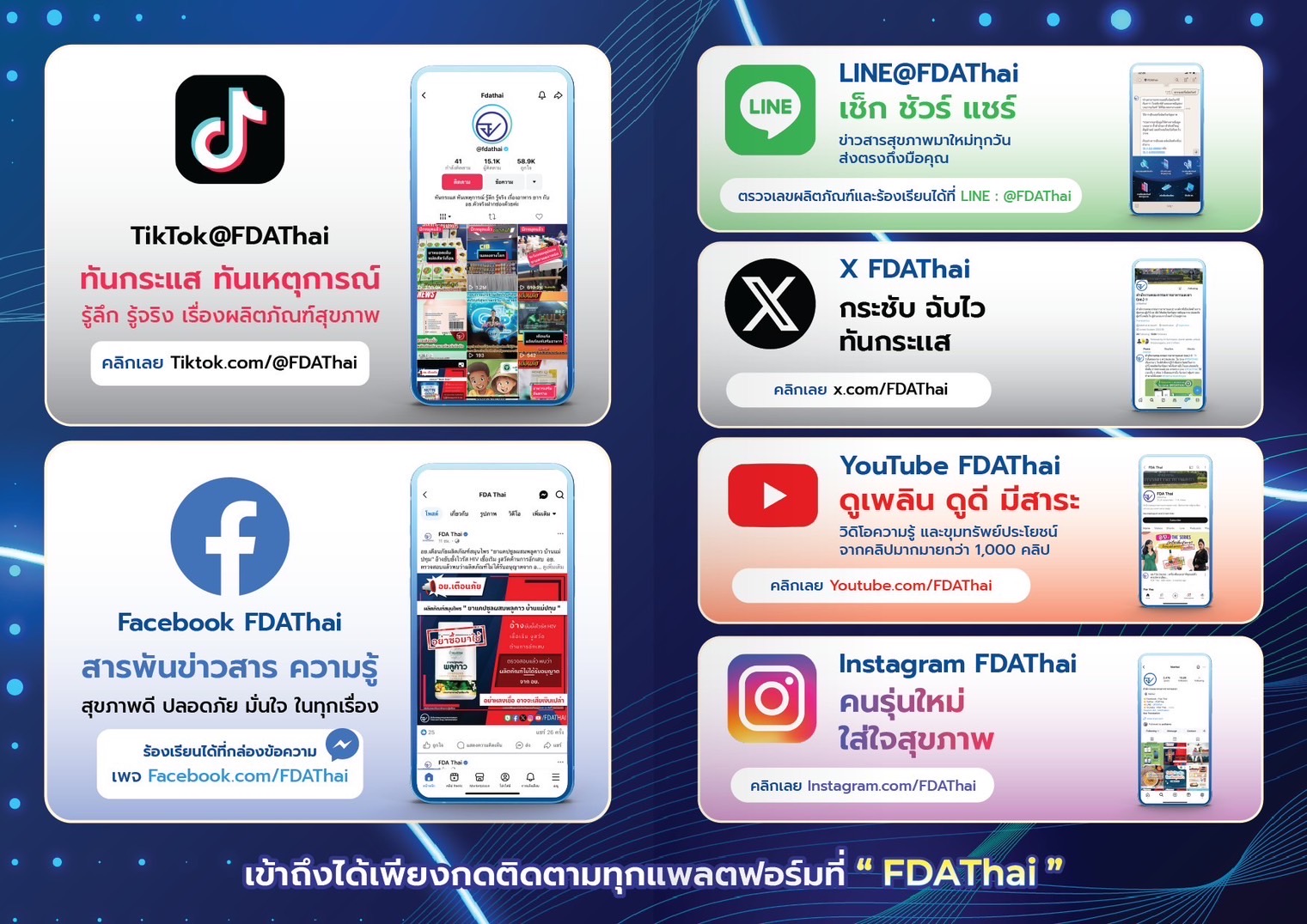 ทันกระแส ทันเหตุการณ์ รู้ลึก รุ้จริง เรื่องผลิตภัณฑ์สุขภาพ เข้าถึงได้เพียงกดติดตามทุกแพลตฟอร์มที่ "FDAThai"